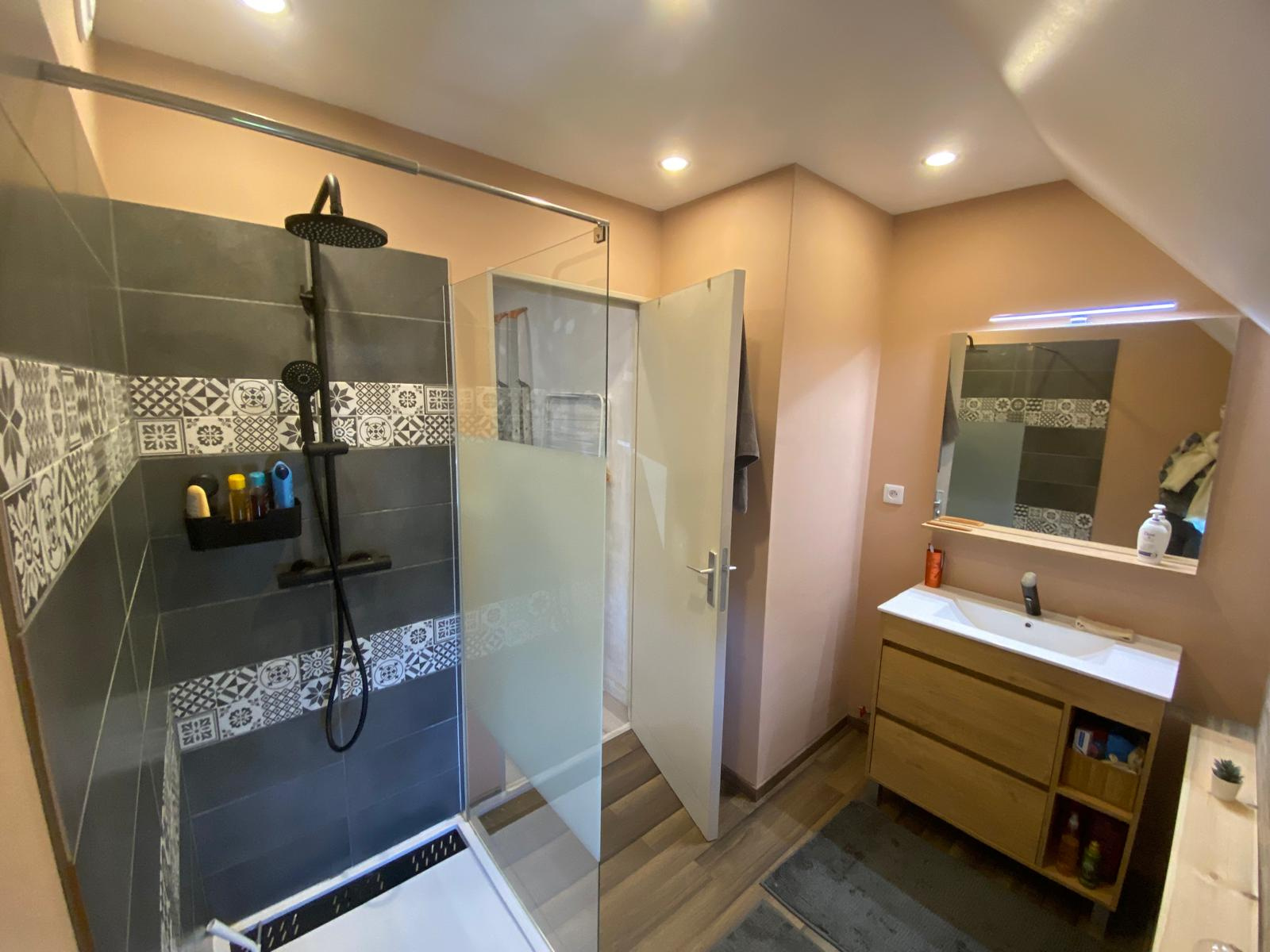 Le premier étage comprend trois chambres, une salle d’eau, ainsi qu’une salle de bains avec WC.